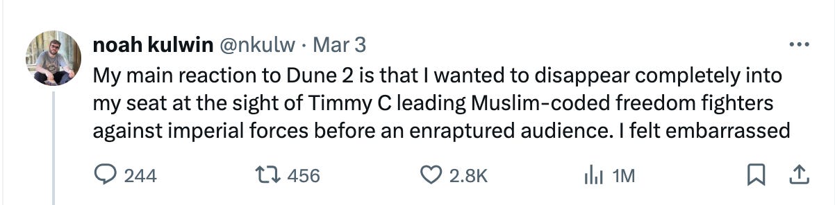 One such critic is Justin Chang, who wrote this review for The New Yorker and who seems to have not considered the logic of his own observations. After a summary of the movie's plot, Chang claims that the lesson of Dune: Part Two is that "faith may be deadlier" than fear. Two paragraphs later, Chang draws parallels between the Fremen, the aforementioned faithful, and the Palestinians: "the movie, pitting Fremen fundamentalists against a genocidal oppressor, can scarcely hope to escape the horror of recent headlines." The implication? Yes, Israel is bad, but what happens if you unchain those religious zealots in Gaza?